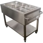 Описание Мобильный тепловой мармит для вторых блюд, предназначен для сохранения температуры готовых блюд и их последующей реализации в банкетных залах и столовых. Широко используется различными кафе, ресторанами и другими предприятиями общественного питания. Ее использование не только дает ощутимую экономию электроэнергии, но и позволяет сохранить блюда в превосходном состоянии без искажения их вкусовых характеристик. Термоперенос в мармите осуществляется за счет водяной бани нагрева гастроемкостей. Этот режим позволяет сохранить все питательные элементы и полезные свойства блюд. Нет риска пригорания продукта. Особенности Ванна на 3 гастроемкости GN 1/1 Адаптеры (разделители) для различных размеров G/N Работа от сети 220 В Низкое потребление 2,8 кВт Нагревательный элемент RICA Italy Плавная регулировка температуры 30-65 °С Колеса со стопором Дополнительная розетка Комплектация 1 гастроемкость GN1/1 2 гастроемкости GN1/2 3 гастроемкости GN1/3