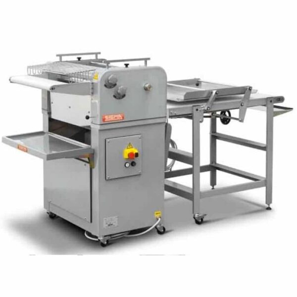 962*1082*708мм, 1,1кВт, 380В, 3 раскаточных валика из пищевого полиэтилентерефталата. Вес тестовых заготовок от 50 до 1200г. Выходная полка на скользящих направляющих. Сверхбыстрая смена лент без демонтирования машины. Материал ленты — woolltop. Управление справа. Открыв переднюю дверцу, вы можете раскатывать плоский хлеб, с регулятором скорости .