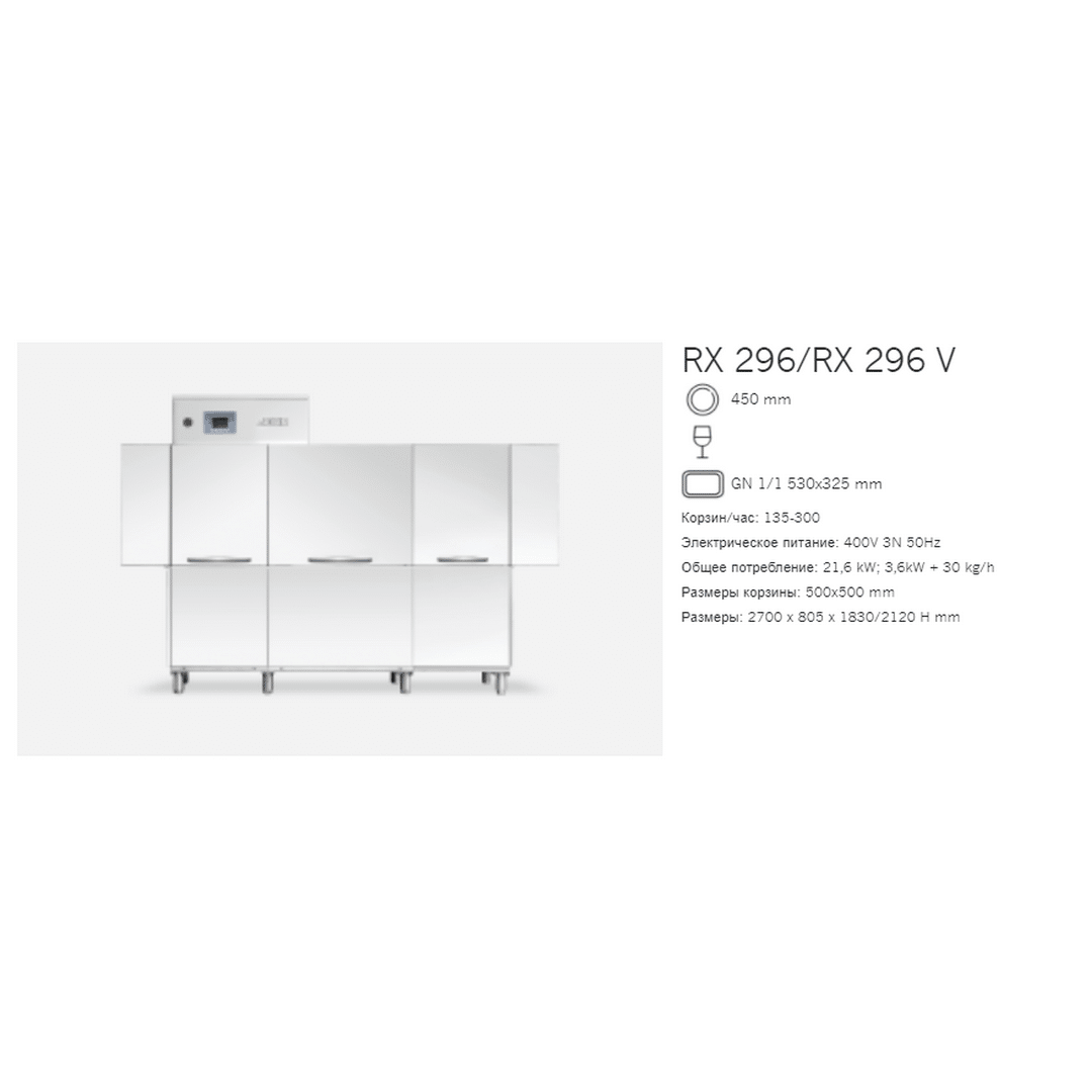 3100*805*1830/2120, 380В, 36.58 кВт, 135-300 кассет/ч, предмойка, двойное ополаскивание, DDE — дозатор моющих и ополас. средств, DR69 — сушка с двойной изоляцией (ID), HR20 — теплорекуператор (сверху): для подключения к холодной воде (потреб. энергии, t и влажн. воздуха в помещен. ниже, чем при доп. мощности); корзины в комплекте: С40 для тарелок, C44 для бокалов, С43 для GN1/1, C47 для приборов, SX — движение СЛЕВА-НАПРАВО