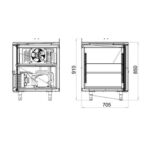 2060х705х850/910 Холодильные столы низкотемпературные Температура: -18° С, работают при температуре окр. среды до +32° С Хладагент R404А . Толщина стенки корпуса 43 мм Объем, л 600 Изготовлен из нерж стали 4 двери. Борт GN1/1, Мощность 550вт.