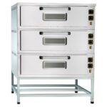 Шкаф пекарский подовый ЭШП-3КП электрический, 3 оцинк. камеры 1035x800x263(233) мм, пароувлажнение, нерж. ТЭН-ы, раздельная регулировка верхних и нижних ТЭН-ов (+50…+320 С), нерж. облицовка, нерж. дверцы с жаропрочным стеклом, краш. боковые и задняя стенки, поды — природный камень, подсветка, 14,64 кВт, 400В, разборный
