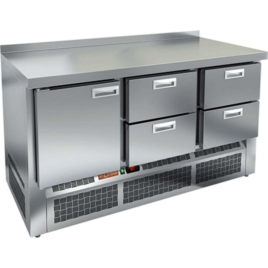 1485х600х850мм, -2/+10, 0,22кВт, 280л, 5 замков (на двери и 4 ящиках) без борта, стол с нижним расположением агрегата,нерж, 1 распашные двери, 4 выдвижных ящика