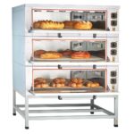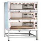 Шкаф пекарский подовый ЭШП-3-01КП электрический, 3 нерж. камеры 1035x800x263(233) мм, пароувлажнение, нерж. ТЭН-ы, раздельная регулировка верхних и нижних ТЭН-ов (+50…+320 С), нерж. облицовка, нерж. дверцы с жаропрочным стеклом, краш. боковые и задняя стенки, поды — природный камень, подсветка, 14,64 кВт, 400В, разборный