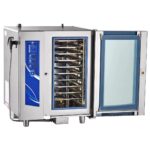 840x800x1055(парогенератор, 10хGN-1/1, память на 110 программ приготовления, 6 программ автоматической мойки, вся нерж, без г/емкостей, 3х-канальный щуп, регулировка влажности, 5 скоростей вращения вентилятора, реверс вентилятора)