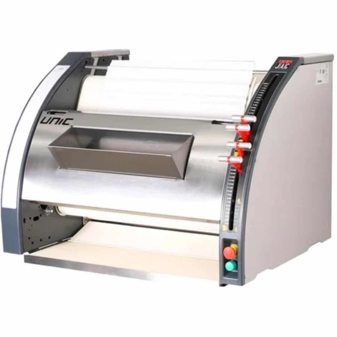 962*1082*708мм, 1,1кВт, 380В, 3 раскаточных валика из пищевого полиэтилентерефталата. Вес тестовых заготовок от 50 до 1200г. Выходная полка на скользящих направляющих. Сверхбыстрая смена лент без демонтирования машины. Материал ленты — woolltop. Управление справа