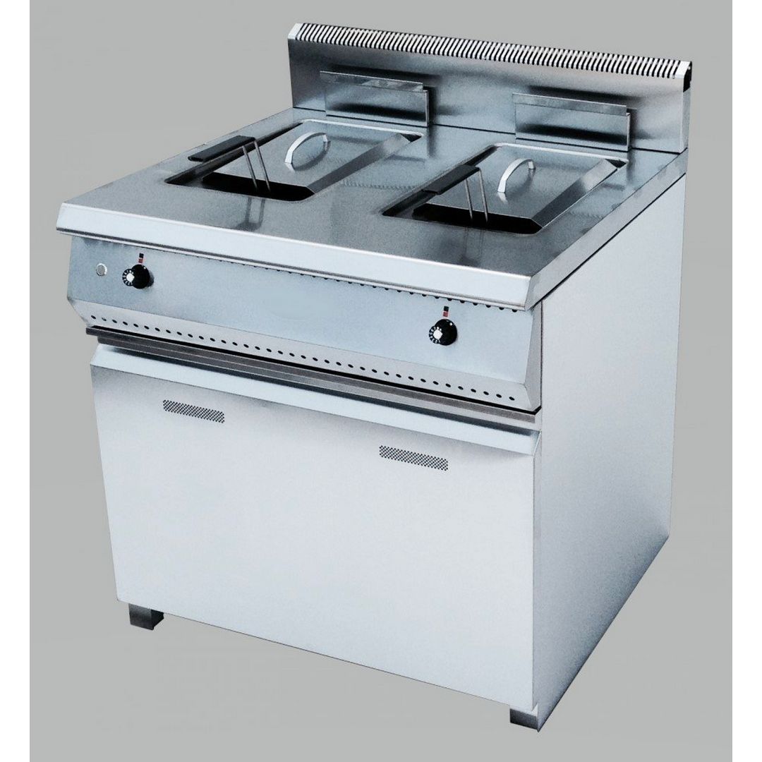 840х800х1050мм, газовая фритюрница 800 линии на закрытом стенде с дверцами, 2 фритюрные ванны max 15+15 литров/рабочий 9+9 л 2 корзина, 2 специальные горелки, с электророзжигом, полный газконтроль, 2 газовых термостата плавно регулирующих температуру масла от +40-190С, газовая мощность 21,4 kW, г.нетто , 100кг, г.брутто: 1000х950х1340, 130кг. полностью из н/стали