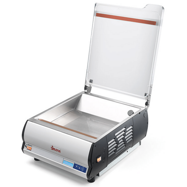 Габариты упаковщика 550 x 440 x 450 мм, 350*415*150 мм (рабочий размер камеры), производительность насоса 16 м3/час, длина сварочной планки 350 мм, 230 В; настольный, цифровая панель управления, 10 изменяемых программ, функция мягкого обжима, функция обслуживания насоса, тестировочные программы, безшовная камера из нержавеющей стали, корпус из нержавеющей стали, прозрачная крышка