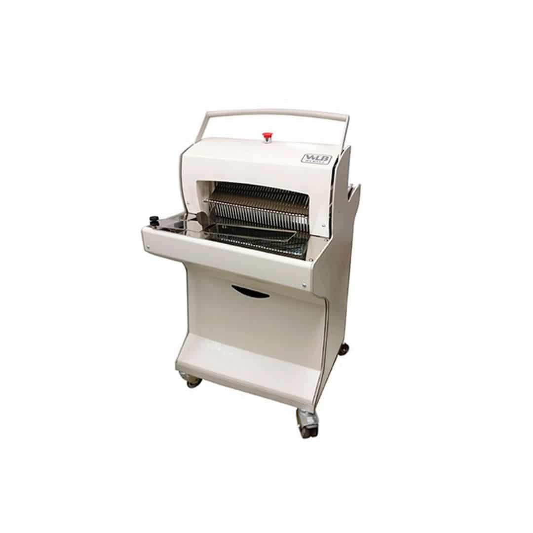 Хлеборезка т.м. WLBake серии BS, модель BS ECO-F (макс. ширина нарезки 420 мм, фиксированная толщина нарезки 11мм), макс. высота буханки 150 мм, планка для упавковки хлеба в пакеты, колеса со стопором, 575x770x1220мм, 500Вт, 380В, напольная