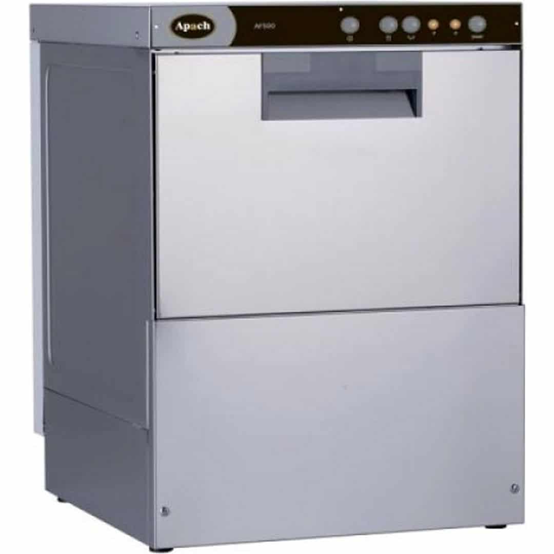 Машина посудомоечная т.м. APACH, модель AF500, 575х605х820мм, 220/380В, 3500Вт, 2 цикла: 40/24 кас./ч, 90/150 сек., высота загрузочн. окна 365мм, подключ. к гор.воде, дозатор ополаскивающего средства, размер кассет 500х500, панель управления электромехан., поверхностные фильтры, помпа слива.