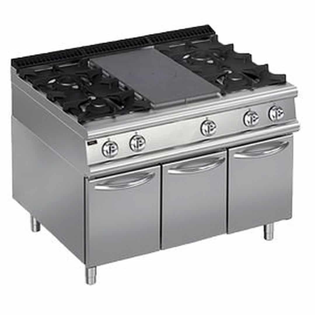 1200х900х870 мм, 115 кг, газ 28 кВт, 1 зона концентрического нагрева по центру + 2 горелки слева + 2 горелки справа, на закрытой подставке