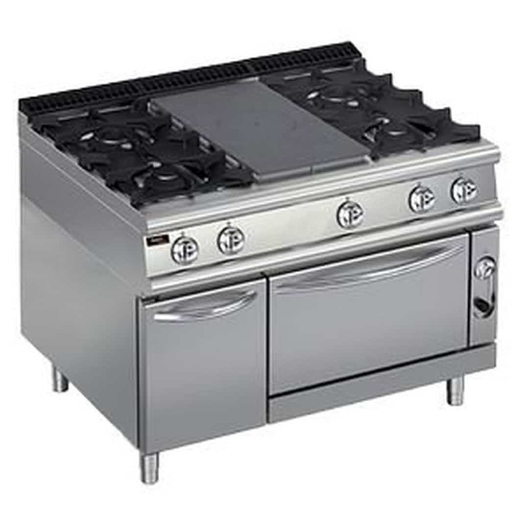 1200х900х870 мм, 170 кг, газ 36,5 кВт, 1 зона концентрического нагрева по центру + 2 горелки слева + 2 горелки справа, на газовом духовом шкафу на 8,5 кВт