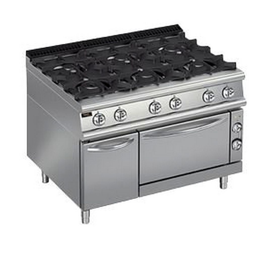 1200х900х870 мм, 216 кг, газ 40,9 кВт, 6 конфорок, на газовом духовом шкафу на 8,5 кВт