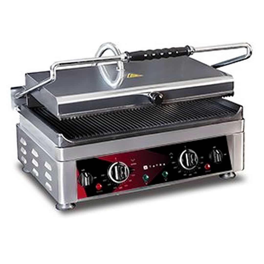510х500х300 мм, 230В, 3 кВт, верхняя и нижняя поверхности рифленные (RR), чугун, размер поверхности 450х270 мм, термостат 50°- 300°C, независимая регулировка температуры нижней и верхней поверхности (DT), корпус нерж., емкость для сбора жира