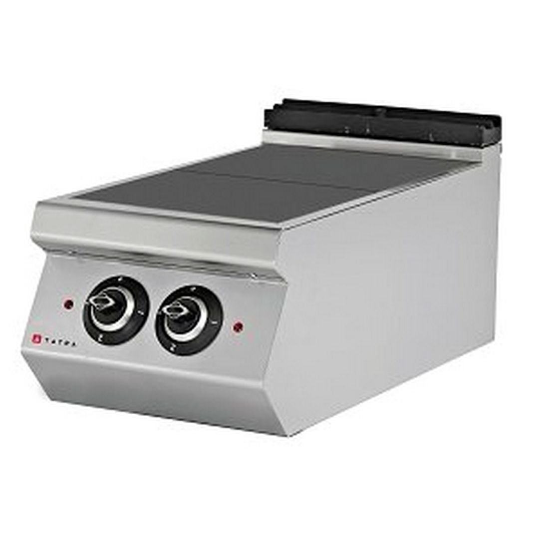 400х760х380 мм, 400В, 5,6 кВт, 2 низкие конфорки 2,8 кВт, 3 уровня мощности нагрева, настольная