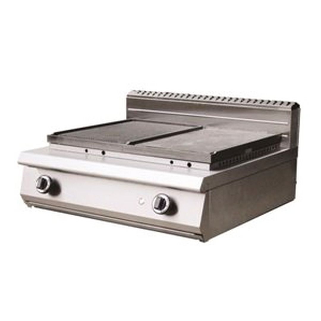 2 специальные горелки с запальной системой розжига, газовая мощность14,4 kW, чугунная рабочая поверхность, 1/2 рифленая, 1/2 гладкая, электророзжиг, газ/контроль, г.нетто 800x800x320 108кг, г.брутто: 950х950х620, 133 кг.