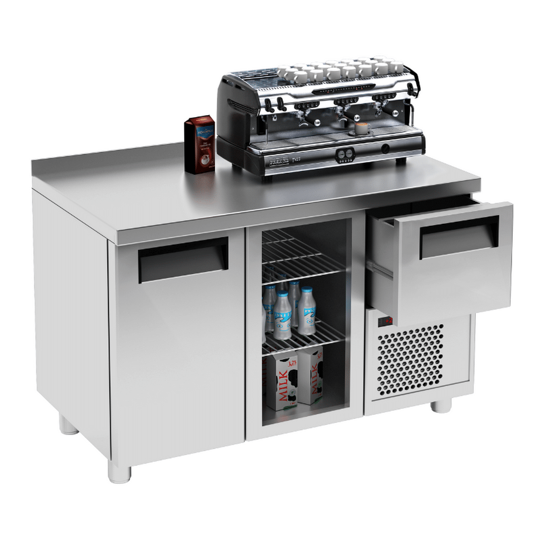 Холодильные столы 570 COFFEE BAR в исполнении "INOX" и "BLACK&STEEL" могут быть использованы под кофемашины  и для хранения молока и кофейных зерен. В данных столах предусмотрен удобный отсек для выбивания холдера кофемашины.