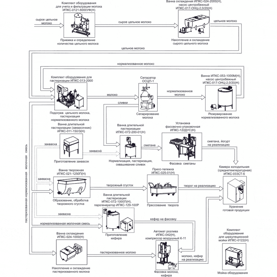 Данное оборудование предназначено для производства творога, упакованных в пластиковые стаканы сметаны и йогурта, упакованных в полиэтиленовые пакеты пастеризованного молока и кефира. Состав: