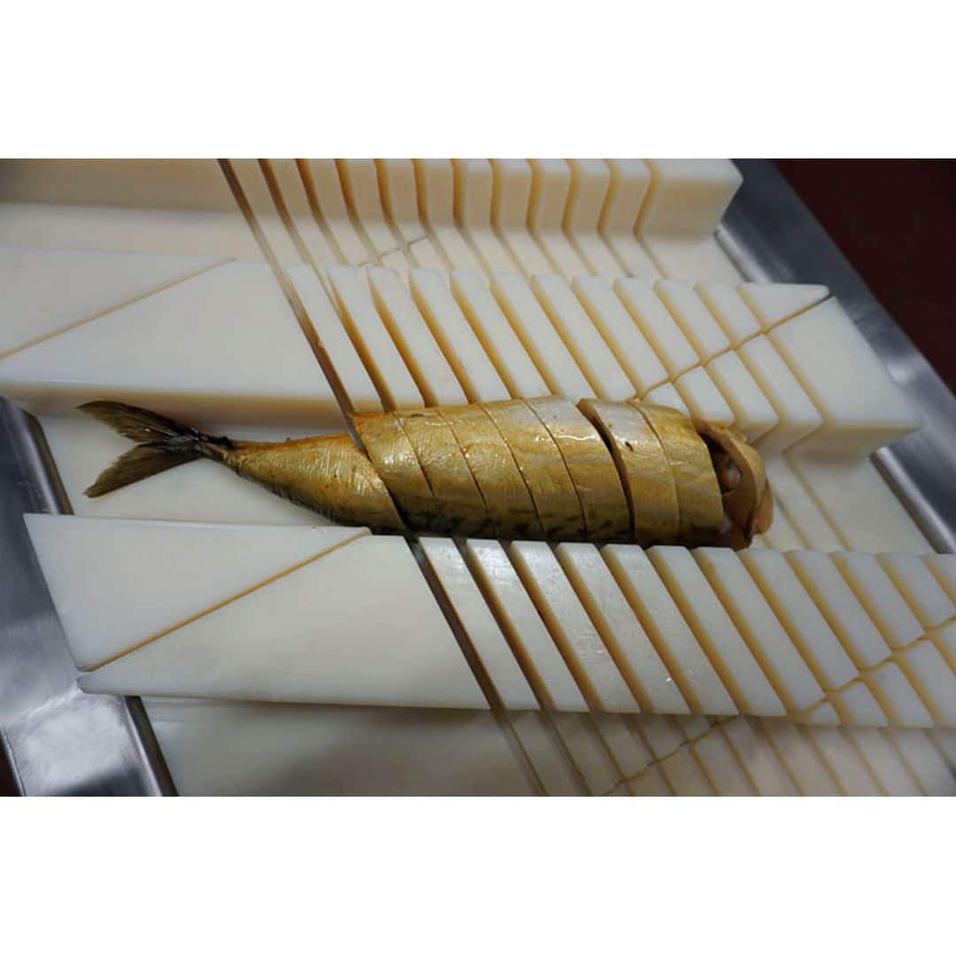 Данное устройство нарезки предназначено для нарезки копченых или соленых тушек скумбрии и сходной по свойствам с ней рыбы под углом на кусочки.