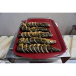 Нарезанная на кусочки рыба далее перемещается в зону удаления ее из модулей. Удаление целесообразно производить с помощью шпателя. В конце транспортера установлен ограничительный флажок в виде металлической рамки. Он служит для предотвращения попадания рук оператора в пространство между транспортером модульным и кожухом в процессе удаления рыбы из модуля транспортера. Срабатывание флажка моментально останавливает движение транспортера.