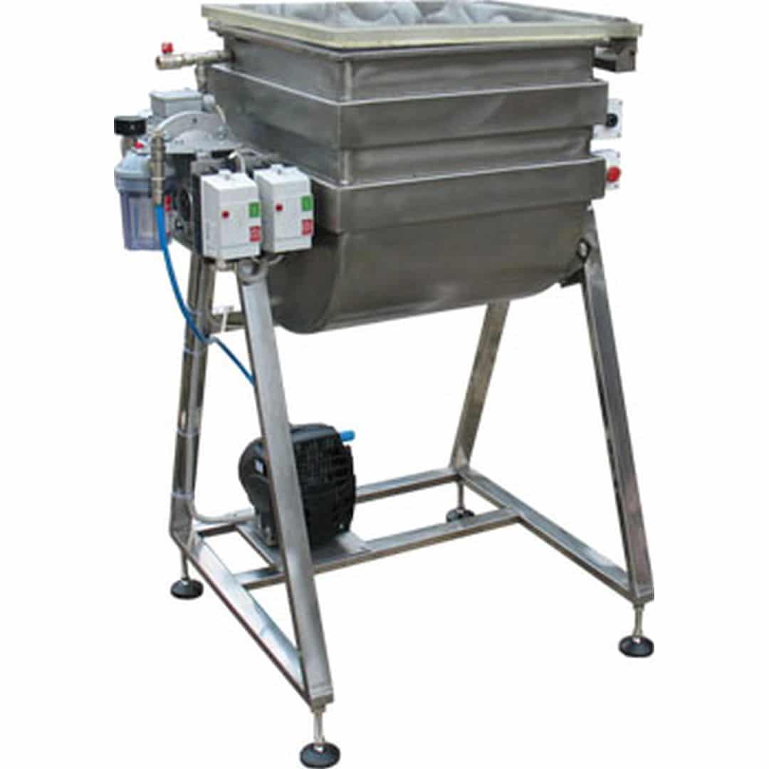 Крышка фаршемешалки выполнена из прозрачного оргстекла, что дает возможность визуально наблюдать за протеканием процесса перемешивания, закреплена на каркасе и оснащена устройством блокировки. Для выгрузки фарша конструктивно обеспечены легкое и удобное опрокидывание дежи, её фиксация в опрокинутом состоянии и возможность включения в этом положении мешалки для удаления остатков продукта. 'Козловая' конструкция каркаса позволяет осуществлять выгрузку готового фарша непосредственно в стандартную чан-тележку (емкостью 100 литров), придвинутую к опрокинутой деже. Оснащена вакуумным насосом и вакууметром для контроля остаточного давления.