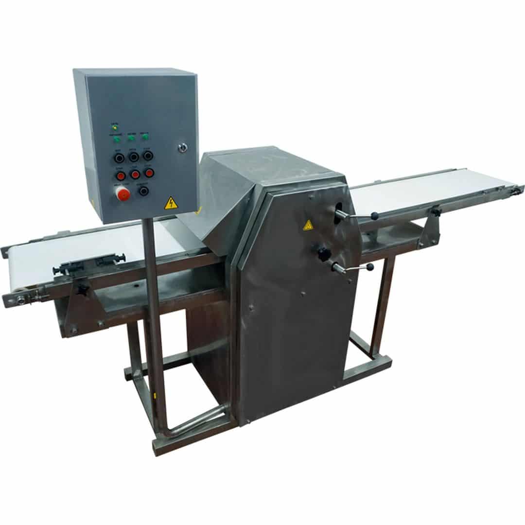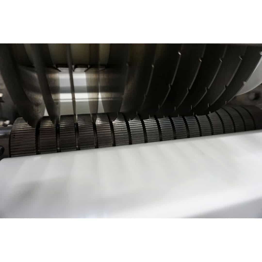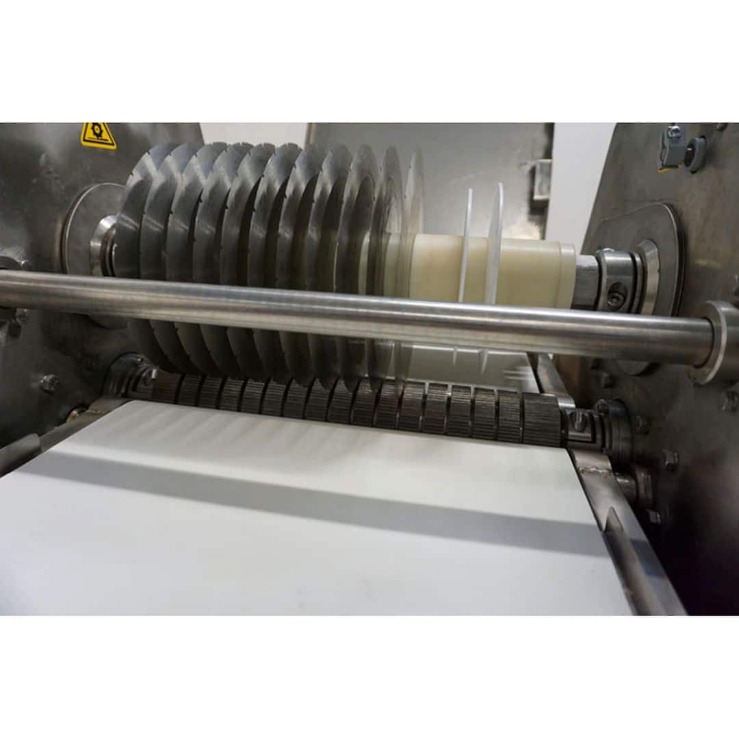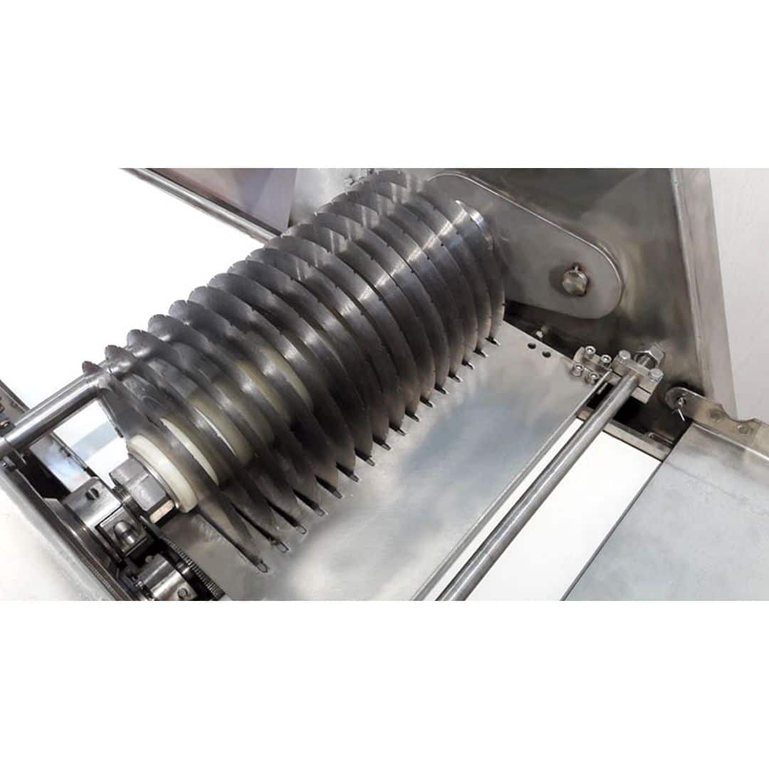 Подача и отведение продукта осуществляется при помощи двух отдельных съемных транспортеров, которые не имеют контакта с ножами. Продукт подается к режущему механизму подводящим транспортером, попадает на вращающийся синхронно с ножами упорный вал и проходит через блок дисковых ножей. Нарезанный продукт попадает на отводящий транспортер.