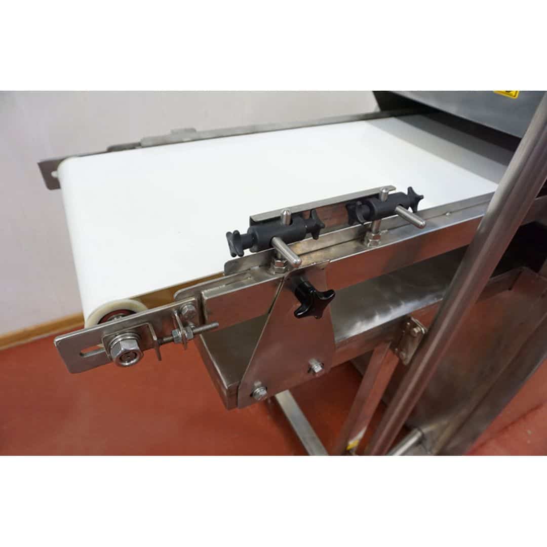 В технологическом процессе исключена возможность контакта ленты с ножами, что может требовать плановой её замены, а также давать вероятность попадания частичек материала ленты в продукт.