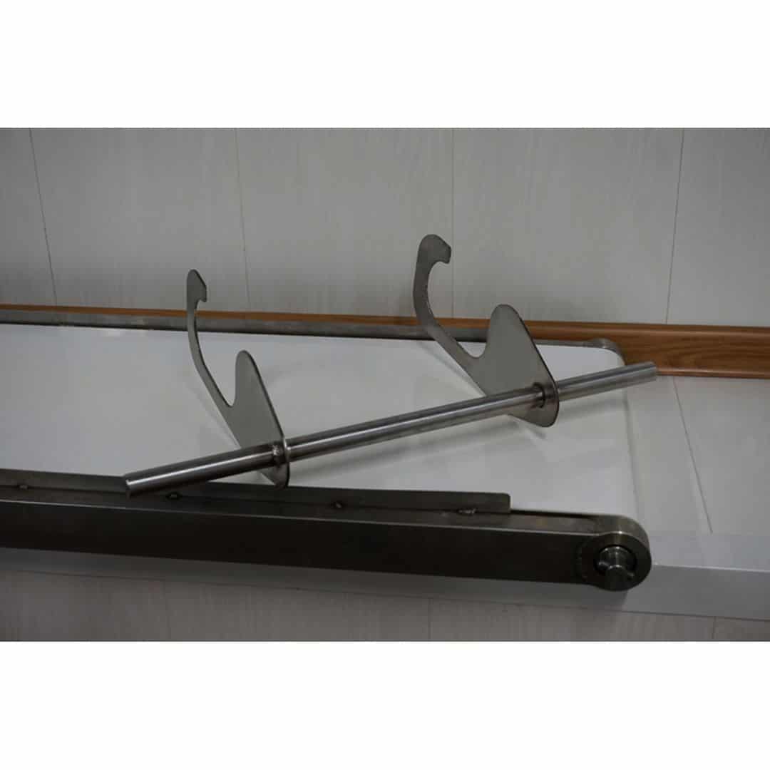 Съемная конструкция транспортеров, ножей, упорного вала позволяют проводить более тщательную мойку рабочих зон устройства, а полностью выполненная из нержавеющей стали конструкция устройства повышает его санитарно-гигиенические характеристики, надежность и долговечность.