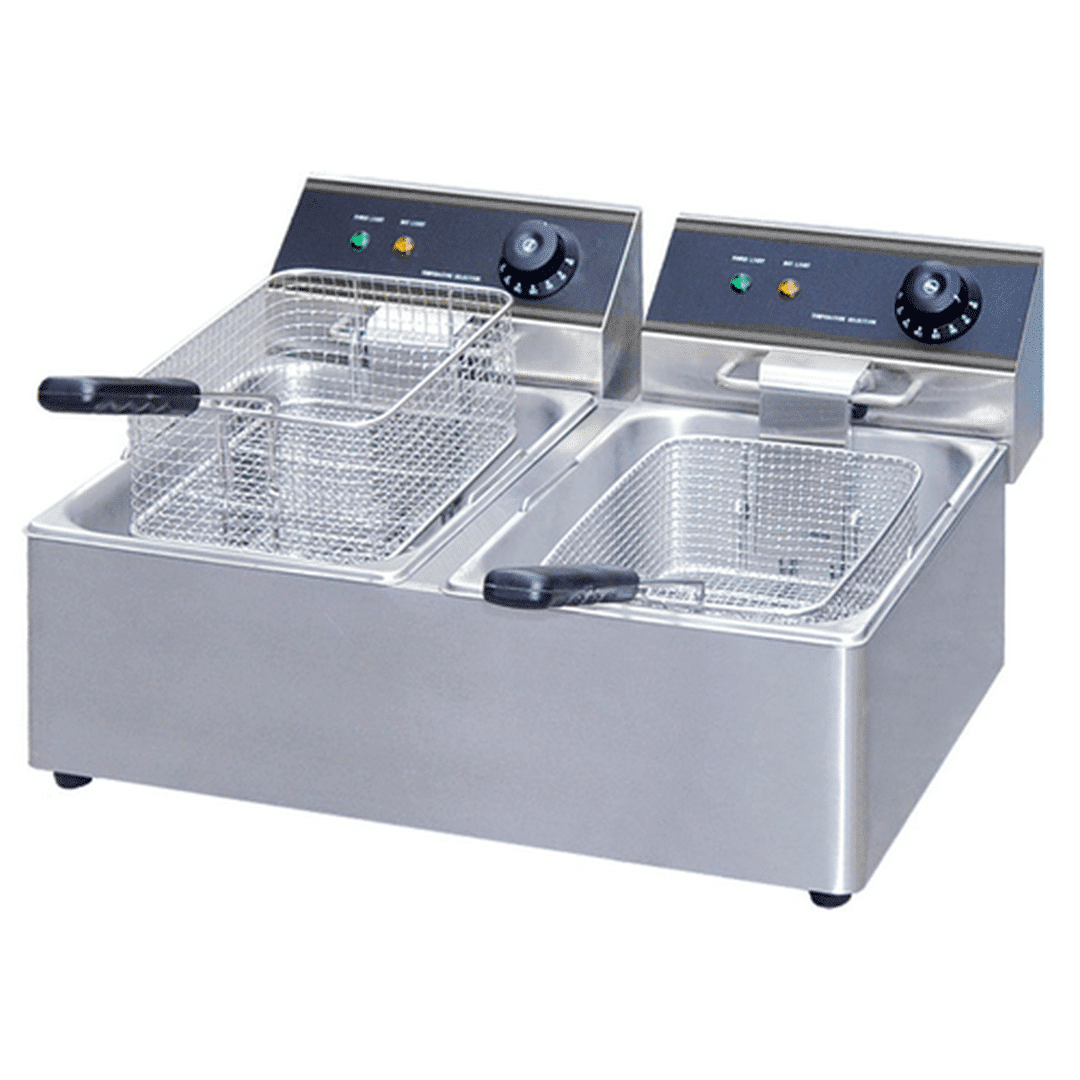 700x560x450мм, 220В, 5+5 кВт, 20 кг, две ванны ёмкостью 16 л, с крышкой, 2 фритюрные корзины, температурный режим 50-190С, идет без вилки