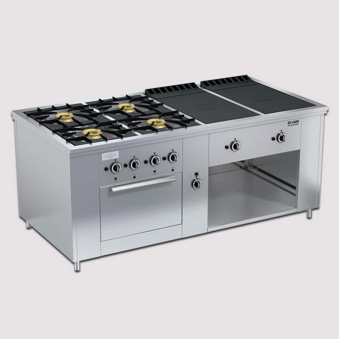 1945х990х850мм, Плита из нержавеющей стали с 4-мя двухрядными горелками и 2-мя варочными чугунными поверхностями. Открытые горелки имеют массивные чугунные решетки размером 430х430 мм, что позволяет размещать на них гастроемкости объемом до 50 л, съёмная подконфорочная емкость. Под чугунными настилами располагаются мощные горелки, быстро и равномерно нагревающие всю поверхность рабочей зоны, благодаря чему на них можно разместить как крупные гастроемкости, так и множество мелких. В нижней части плиты имеется ниша для хранения кухонного инвентаря. Газконтроль, запальные горелки, пьезоподжиг каждой горелки, работа на природном или сжиженном газе. Ножки плиты регулируются по высоте, 4х8,0кВт+2х10,0кВт. Расход газа: прир (сжиж)-5,41 (4,21)м3?ч (кг/ч) Брутто: 267кг