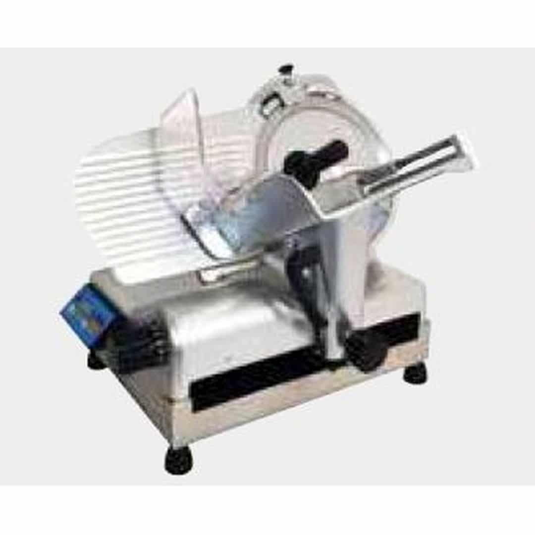 Габариты 685x540x545 мм. Диаметр ножа 300 мм, рез 280 X 220мм. Толщина нарезки регулируется, до 15 мм. Вертикальный слайсер для нарезки мяса, сыра, колбасных изделий и других продуктов питания. Толщина нарезки 0-15 мм. Слайсер для профессионального использования на предприятиях общественного питания. Нож из хромированной стали, корпус из лакированного алюминия с пластиковыми деталями. Основания — нерж. сталь. Электронная панель упарвления, 3 скорости. Ременной привод