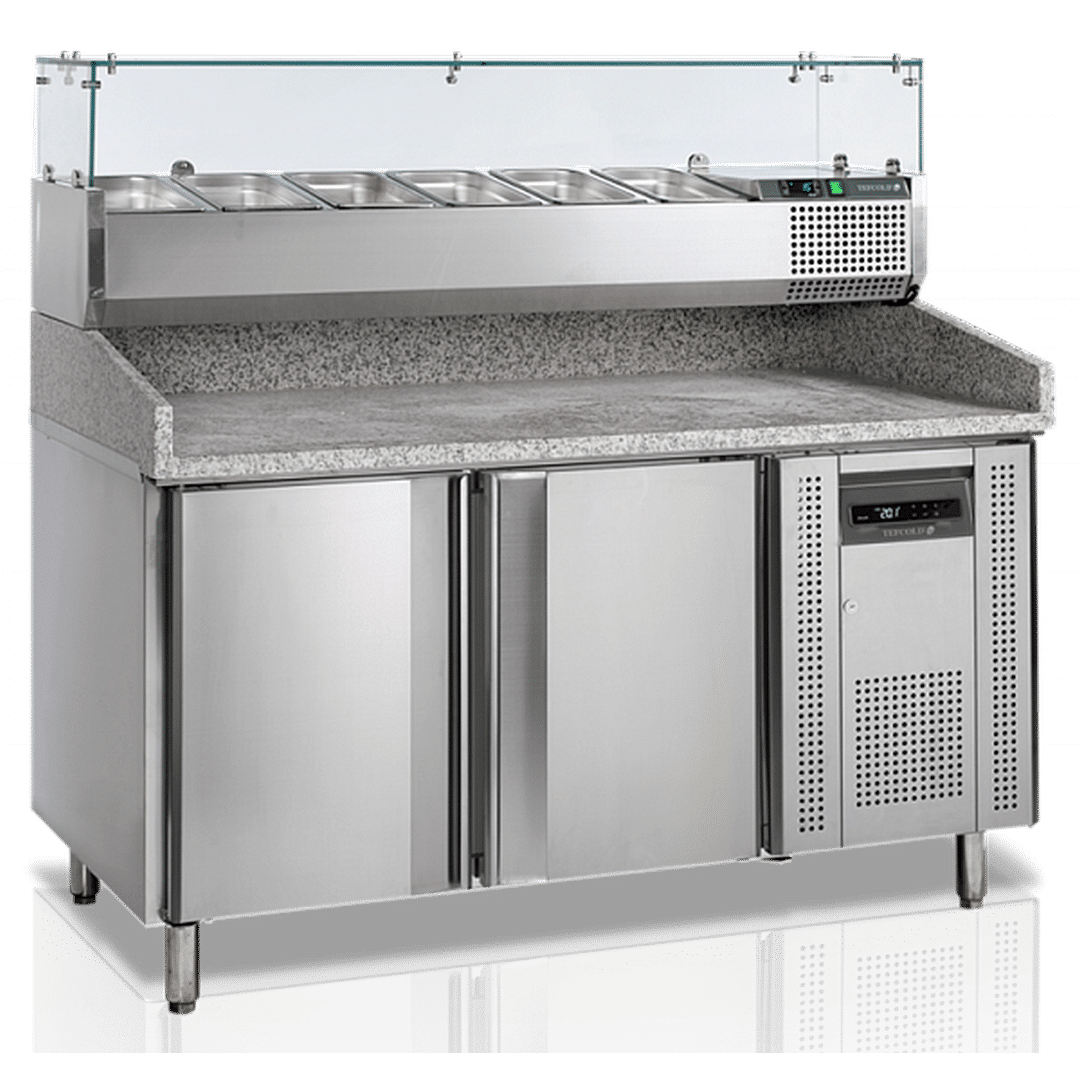 1510х800х1445мм, 0,3кВт, 220В, GN1/3, t=+2/+10С, брутто/нетто — 390/370л, 294кг, с встр. агр., R600a, нерж.сталь, направляющие под 7 противней для пиццы в каждом отсеке (400×600мм), гранитная столешница, вент. охлаждение, автооттайка, 2 самозакрывающиеся двери, регулируемые ножки, в поставке=2 места (стол PT1200+ витрина VK38-150). Гастроемкости в комплект не входят!