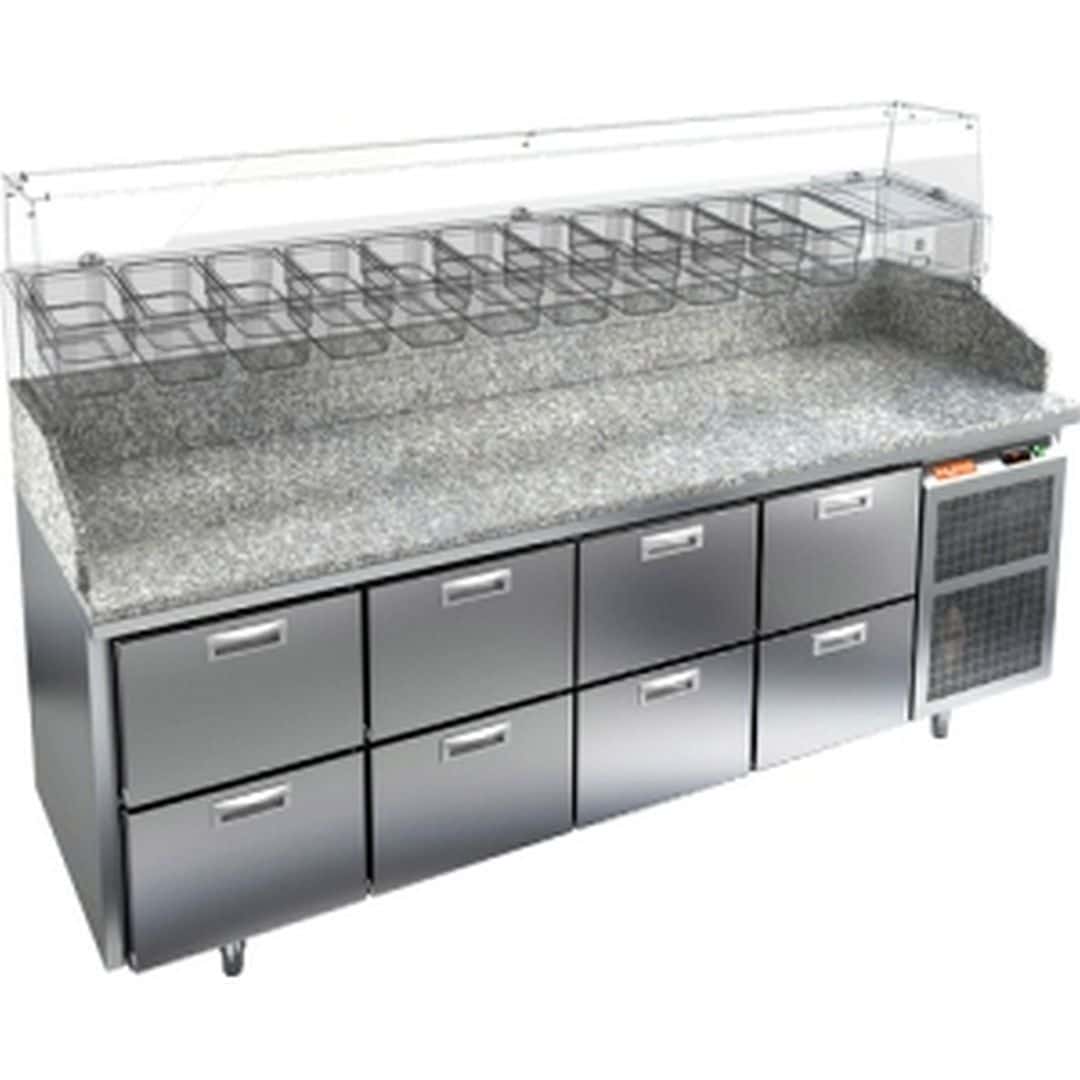 2280х700х1050мм, PZ3-2222/GN КАМЕНЬ стол для пиццы охл.(+2+10), 8 ящиков, с бортом с 3х сторон, 2280х700х1050мм,