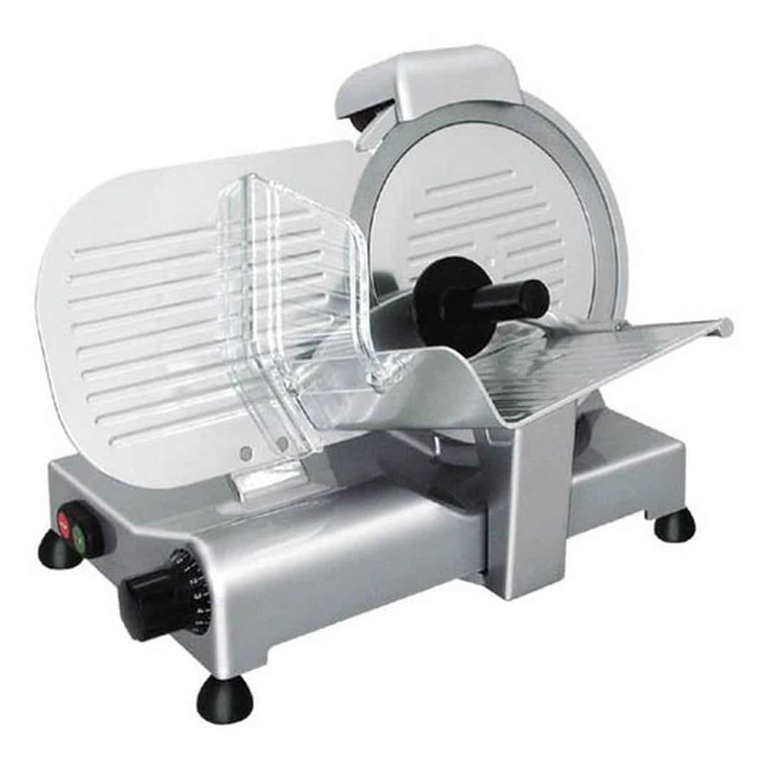 Габариты 530 x 442 x H 345 мм. Диаметр ножа 250 мм, рез 230×185 мм. Полуавтоматический слайсер для нарезки мяса, сыра, колбасных изделий и других продуктов питания. Толщина нарезки 0-14?16 мм. Слайсер для профессионального использования на предприятиях общественного питания. Нож из хромированной стали, корпус из лакированного алюминия с пластиковыми деталями. Фиксированное заточное устройство.