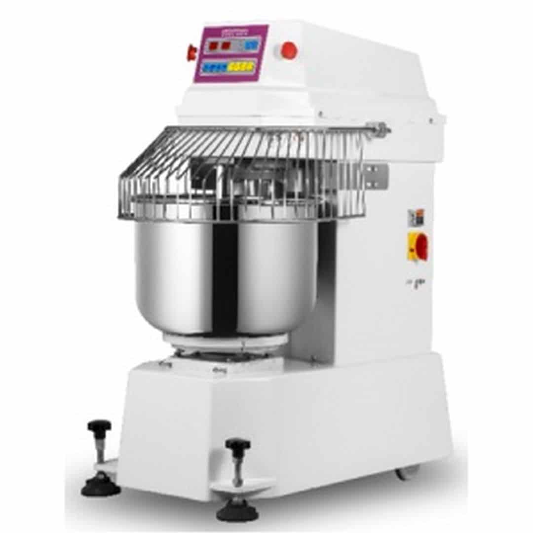 1175x730x1230мм, 380В, 6,3кВт, 2-скор. двиг., фикс. дежа н/ст 130 л, крюк., разовый замес — 50 кг муки, примерно 75 кг теста, скорость вращения крюка — 245/122 об/мин., скорость вращения дежи 18 об/мин.