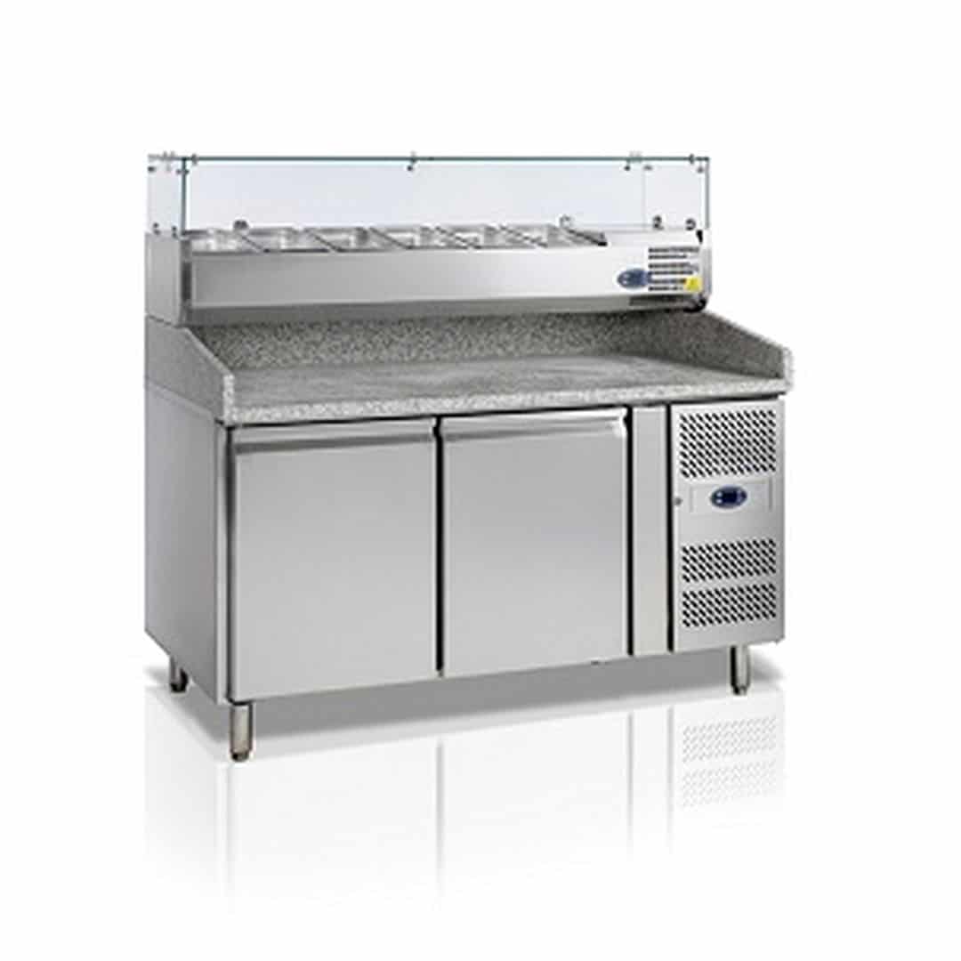 1510х800х1445мм, 0,3кВт, 220В, GN1/3, t=+2/+10С, брутто/нетто — 390/370л, 243кг, с встр. агр., R600a, нерж.сталь, направляющие под 7 противней для пиццы в каждом отсеке (400×600мм), гранитная столешница, вент. охлаждение, автооттайка, 2 самозакрывающиеся двери, регулируемые ножки, в поставке=2 места. Витрина для топпингов VK38-150 не входит в комплект! См. СТОЛ ДЛЯ ПИЦЦЫ TEFCOLD PT1200 + VK38-150