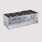 Габариты (шхгхв), мм: 2420х990х850(760) Мощность горелок, кВт: 2х10,0 и 6х8,0 Мощность духового шкафа, кВт: 3х8,0 Артикул: 82573 Масса, кг: 530 Расход природного (сжиженного) газа, м3⁄ч (кг/ч): 9,57 (7,45) Резьба входного патрубка газопровода: G¾-B Количество уровней духового шкафа: 6 Материал корпуса: нержавеющая сталь Материал рабочей поверхности: чугун Дополнительные параметры: газконтроль, запальные горелки, пьезорозжиг Комплектация: плита, инструкция, 6 противней Гарантия: 1 год Плита газовая ПРГ-IIA-10-2 3ДШ «Maxi» Профессиональная газовая плита c 3-мя духовыми шкафами, 6-ю мощными двухрядными горелками и 2-мя варочными поверхностями, выполненными из чугуна, прекрасно аккумулирующего и долго сохраняющего тепло. Открытые горелки имеют массивные чугунные решетки размером 430х430 мм, что позволяет размещать на них посуду объемом до 50 л. Под чугунным настилом располагается горелка специальной формы, которая быстро и равномерно нагревает всю поверхность рабочей зоны, благодаря чему на ней можно разместить как крупные гастроемкости, так и множество мелких. Рабочий диапазон температур в жарочном шкафу составляет 110-325 °С, в комплект входят 2 противня из нержавеющей стали размером 530х650х40 мм. Плита оснащена системой газконтроля, исключающей утечку газа и может работать как на природном, так и на сжиженном газе. Все горелки имеют пьезоподжиг. Съёмная подконфорочная ёмкость и корпус из высококачественной нержавеющей стали значительно облегчают уход за плитой. Ножки плиты регулируются по высоте, компенсируя неровности пола. С выкрученными ножками высота плиты составляет 760 мм, что существенно облегчает ее транспортировку, позволяя занести в стандартный дверной проем. Плита идеально подходит для предприятий общественного питания с высокой проходимостью, а также детских дошкольных и школьных учреждений, санаториев и больниц, где важны удобство, простота и безопасность эксплуатации в сочетании с высокой скоростью приготовления блюд. Для повышения функциональности плиты и оптимизации рабочего пространства кухни на плиты серии Maxi можно установить Дополнительные Опции:. Дополнительные Опции: Противень из нерж. стали GN2/1 Мобильная плита (на колесах) Полка боковая навесная (990х300 мм)