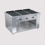 Габариты (шхгхв), мм: 1470х990х850(760) Мощность горелок, кВт: 3х10,0 Мощность духового шкафа, кВт: нет Артикул: 8235 Масса, кг: 270 Расход природного (сжиженного) газа, м3⁄ч (кг/ч): 3,11 (2,42) Резьба входного патрубка газопровода: G¾-B Материал корпуса: нержавеющая сталь Материал рабочей поверхности: чугун Дополнительные параметры: газконтроль, запальные горелки, пьезорозжиг Комплектация: плита, инструкция Гарантия: 1 год Плита газовая ПРГ-IIA-3C «Maxi» Профессиональная газовая плита с 3-мя варочными поверхностями, выполненными из чугуна материала прекрасно аккумулирующего и долго сохраняющего тепло. Под чугунными настилами располагаются мощные горелки специальной формы, которые быстро и равномерно нагревают всю рабочую зону. Единая ровная поверхность дает возможность готовить несколько блюд одновременно, а также менять интенсивность нагрева путем свободного перемещения посуды по всей рабочей зоне плиты. Плита оснащена системой газконтроля, исключающей утечку газа, и может работать как на природном, так и на сжиженном газе. Все горелки имеют пьезоподжиг. Корпус плиты изготовлен из высококачественной нержавеющей стали, что значительно облегчает уход за ней. В нижней части устройства имеется ниша для хранения кухонного инвентаря. Ножки плиты регулируются по высоте, компенсируя неровности пола. С выкрученными ножками высота плиты составляет 760 мм, что существенно облегчает ее транспортировку, позволяя занести в стандартный дверной проем. Плита идеально подходит для предприятий общественного питания с высокой проходимостью, а также детских дошкольных и школьных учреждений, санаториев и больниц, где важны удобство, простота и безопасность эксплуатации в сочетании с высокой скоростью приготовления блюд. Для повышения функциональности плиты и оптимизации рабочего пространства кухни на плиты серии Maxi можно установить Дополнительные Опции:. Дополнительные Опции: Распашные двери Мобильная плита (на колесах) Полка боковая навесная (990х300 мм)