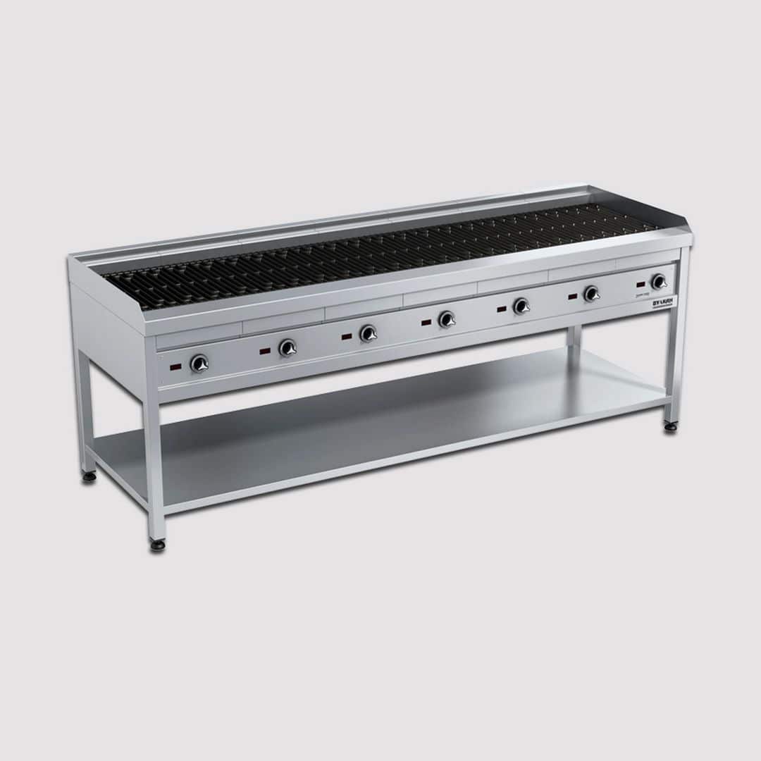 Габариты (шхгхв), мм: 2200х700х850 Мощность, кВт: 31,5 (с 7 зонами нагрева по 4,5 кВт) Материал рабочей зоны: чугунная решетка Питание, В: 380 C лавовыми камнями