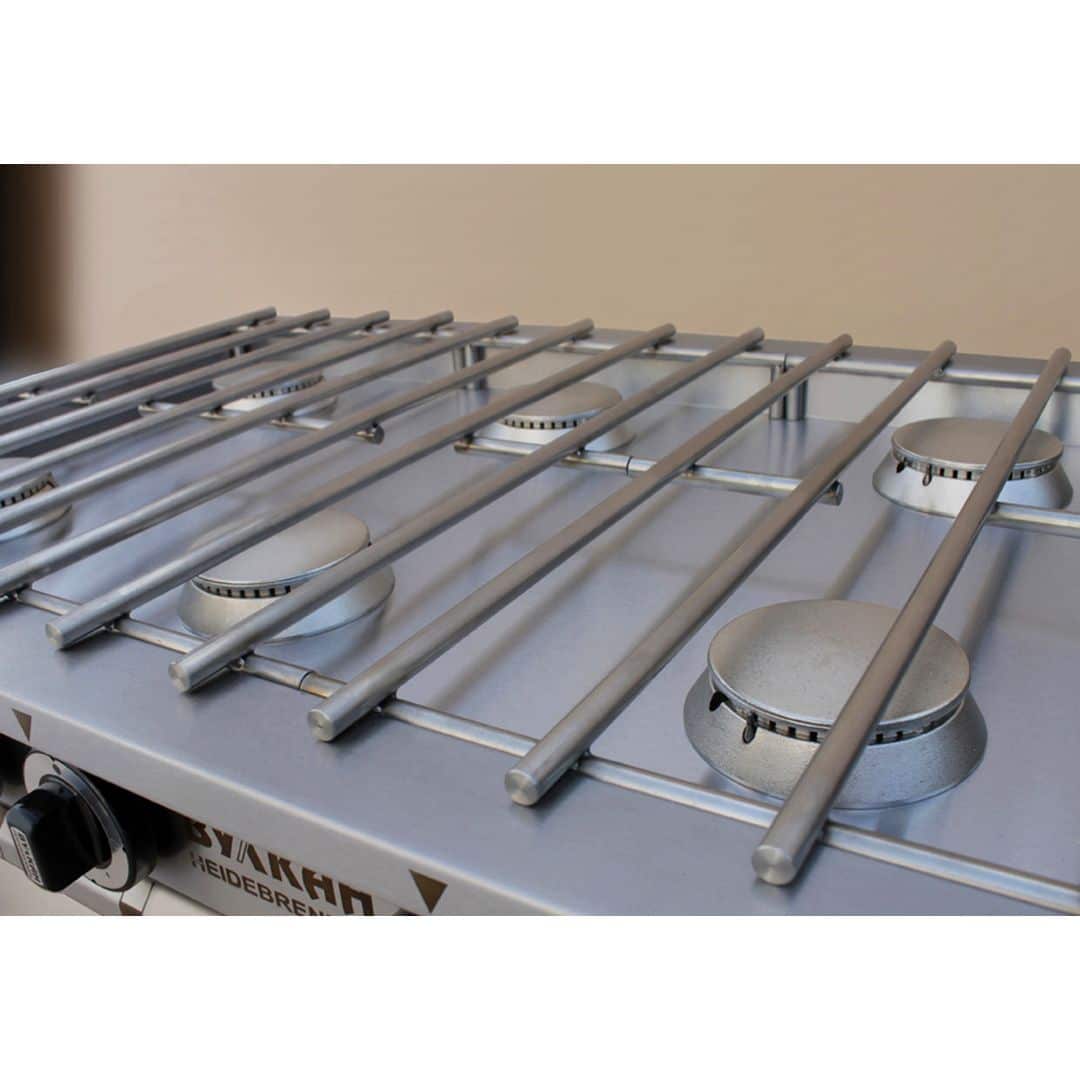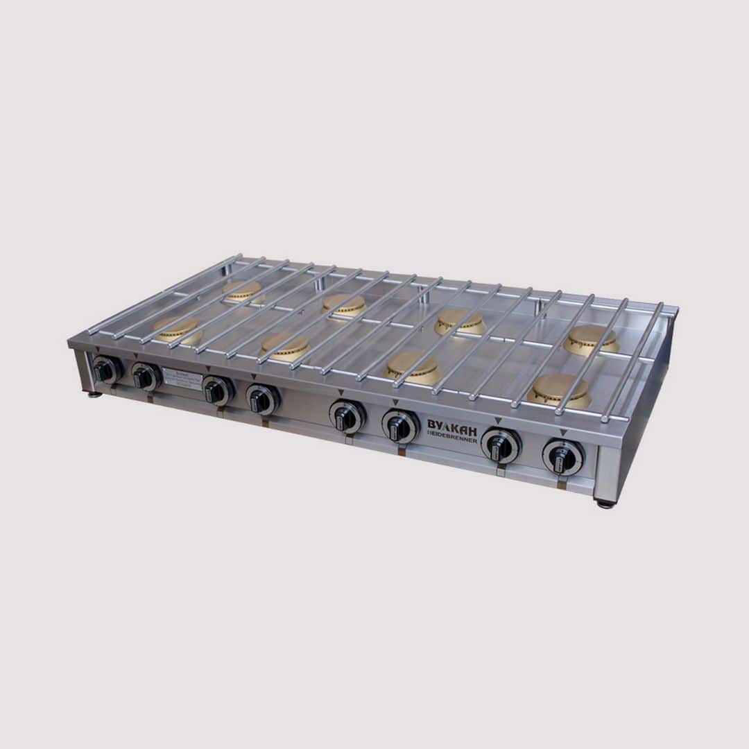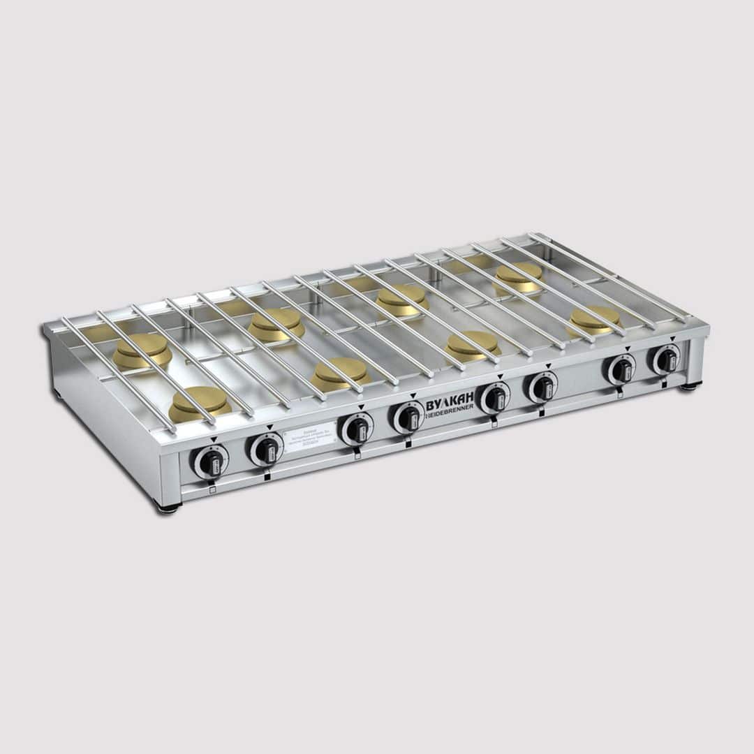 Габариты (шхгхв), мм: 1200х650х150 Мощность горелок, кВт: 8×4,0 Исполнение: настольное Артикул: 82142 Масса, кг: 25 Расход природного (сжиженного) газа, м3⁄ч (кг/ч): 3,25 (2,53) Резьба входного патрубка газопровода: G½-B Материал корпуса: нержавеющая сталь Материал решетки: нержавеющая сталь Дополнительные параметры: газконтроль Комплектация: плита, инструкция Гарантия: 1 год Плита газовая ПРГ-IIA-8М «Slim» Ультратонкая настольная газовая плита ПРГ-IIА-8М «Slim» имеет компактные размеры, благодаря чему свободно располагается на стандартном рабочем столе глубиной 600 мм. При этом на ее варочной поверхности могут одновременно разместиться 8 кастрюль объемом 30 л. Плита имеет 8 латунных горелок мощностью 4 кВт каждая и съёмную решетку из нержавеющей стали. Корпус плиты также выполнен из нержавеющей стали. Плита оснащена газконтролем и может работать как на природном, так и на сжиженном газе. Эта модель подходит для предприятий общественного питания с высокой проходимостью. Главным ее достоинством является простота эксплуатации, а компактные размеры позволяют разместить плиту даже в малогабаритной кухне. *При необходимости плиту можно комплектовать горелками мощностью 6 кВт.