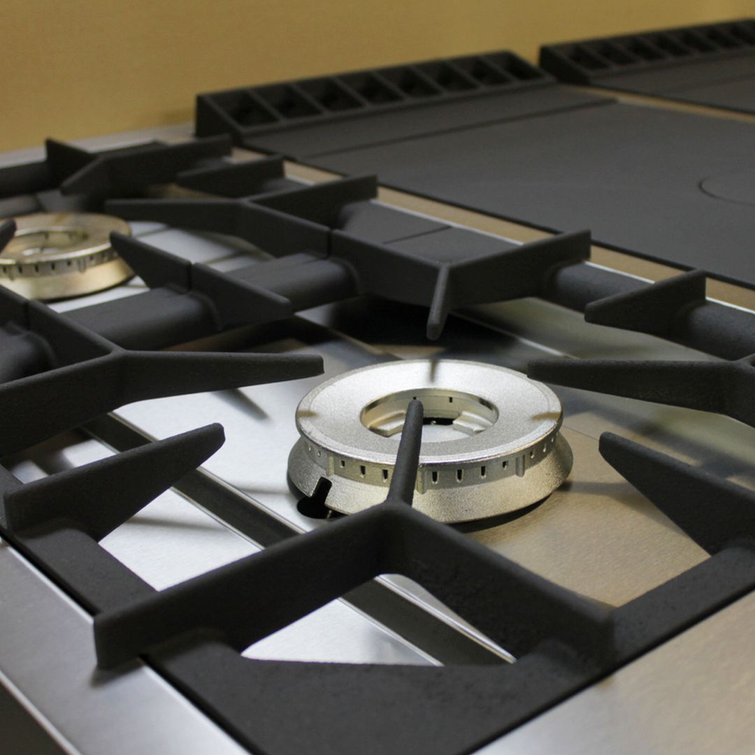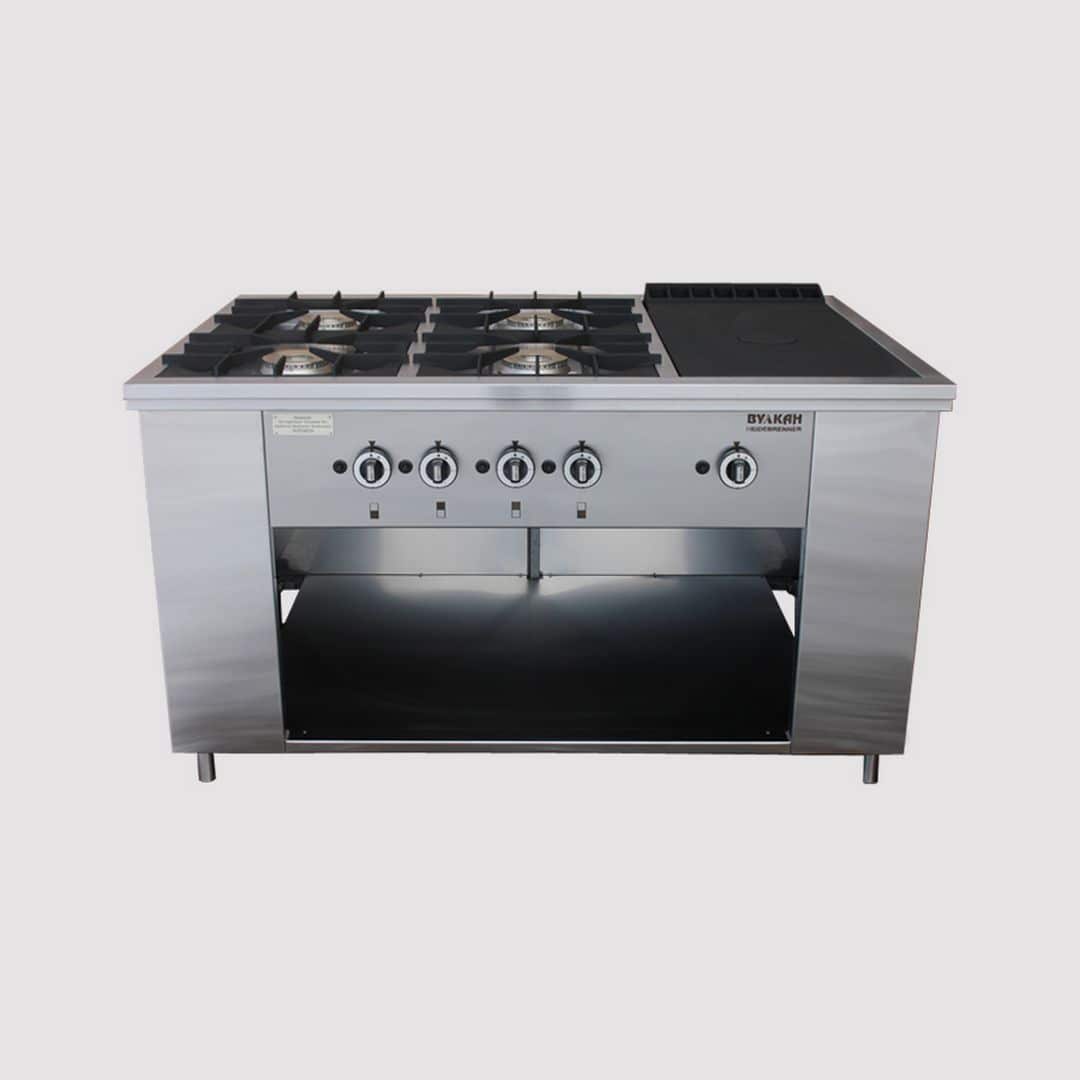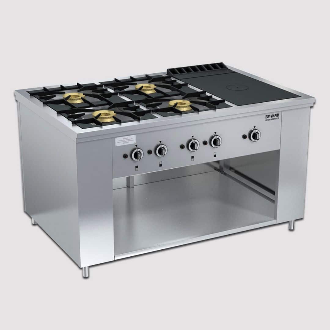 Габариты (шхгхв), мм: 1470х990х850(760) Мощность горелок, кВт: 1х10,0 и 4х8,0 Мощность духового шкафа, кВт: нет Артикул: 8233 Масса, кг: 222 Расход природного (сжиженного) газа, м3⁄ч (кг/ч): 4,37 (3,40) Резьба входного патрубка газопровода: G¾-B Материал корпуса: нержавеющая сталь Материал рабочей поверхности: чугун Дополнительные параметры: газконтроль, запальные горелки, пьезорозжиг Комплектация: плита, инструкция Гарантия: 1 год Плита газовая ПРГ-IIA-6-1 «Maxi» Профессиональная газовая плита с 4-мя мощными двухрядными горелками и варочной поверхностью, выполненной из чугуна материала прекрасно аккумулирующего и долго сохраняющего тепло. Открытые горелки имеют массивные чугунные решетки размером 430х430 мм, что позволяет размещать на них гастроемкости объемом до 50 л. Под чугунным настилом располагается горелка специальной формы, которая быстро и равномерно нагревает всю поверхность рабочей зоны, благодаря чему на ней можно разместить как крупные гастроемкости, так и множество мелких. Съёмная подконфорочная емкость и корпус из высококачественной нержавеющей стали значительно облегчают уход за плитой. В нижней части плиты имеется ниша для хранения кухонного инвентаря. Плита оснащена системой газконтроля, исключающей утечку газа и может работать как на природном, так и на сжиженном газе. Все горелки имеют пьезоподжиг. Ножки плиты регулируются по высоте, компенсируя неровности пола. С выкрученными ножками высота плиты составляет 760 мм, что существенно облегчает ее транспортировку, позволяя занести в стандартный дверной проем. Плита идеально подходит для предприятий общественного питания с высокой проходимостью, а также детских дошкольных и школьных учреждений, санаториев и больниц, где важны удобство, простота и безопасность эксплуатации в сочетании с высокой скоростью приготовления блюд. Для повышения функциональности плиты и оптимизации рабочего пространства кухни на плиты серии Maxi можно установить Дополнительные Опции:. Дополнительные Опции: Распашные двери Мобильная плита (на колесах) Полка боковая навесная (990х300 мм) Двустороннее управление