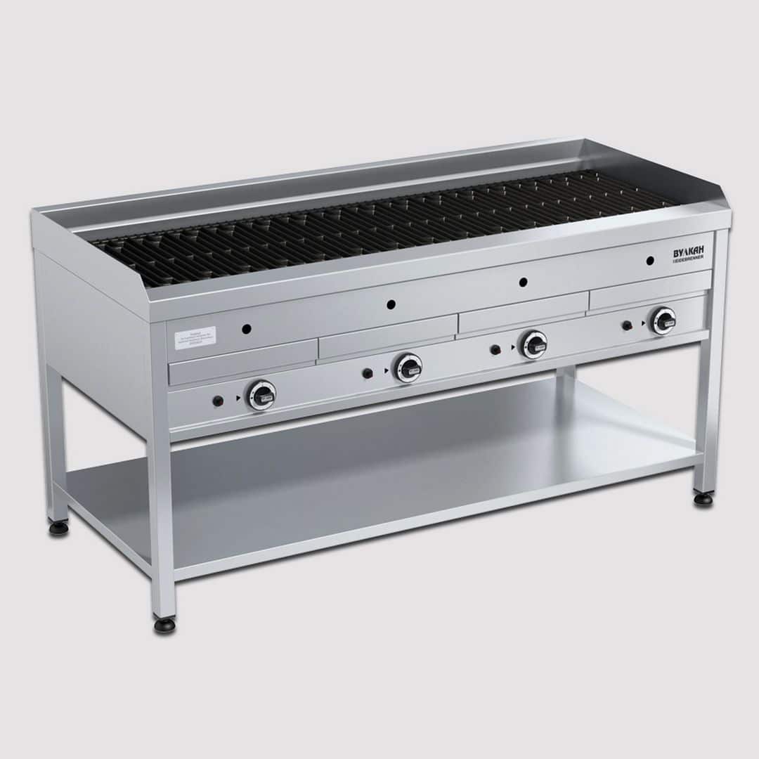 Габариты (шхгхв), мм: 1600х700х850 Мощность, кВт: 4х12,1 Исполнение: напольное Расход природного, м3/ч(сжиженного, кг/ч) газа: 4,91 (3,82) Резьба входного патрубка газопровода: G¾-B Защитный борт, мм: 50 Высота мангала, мм 100 Газконтроль, запальная горелка, пьезорозжиг, чугунные решетки Ширина гриля 1400 мм