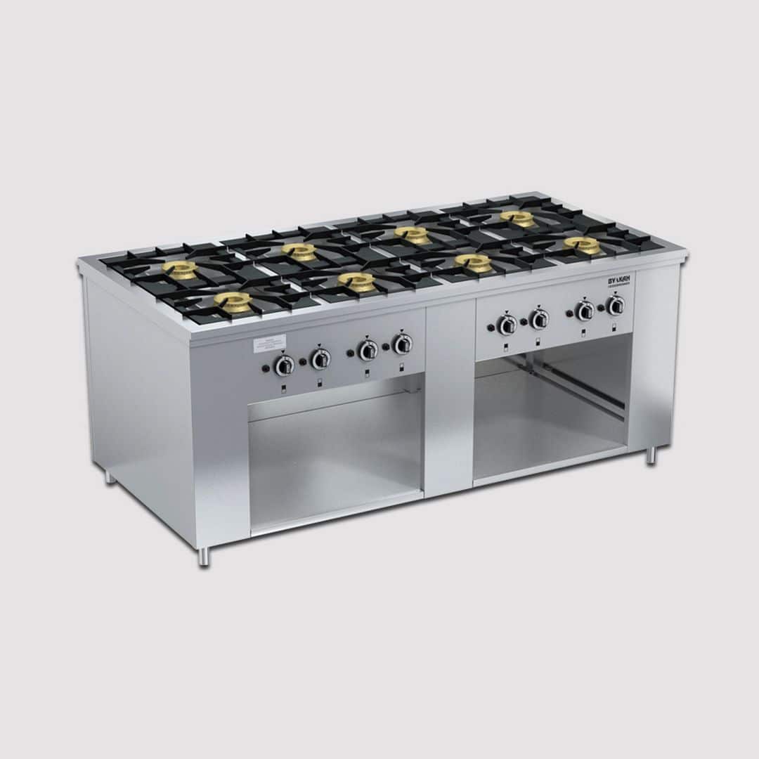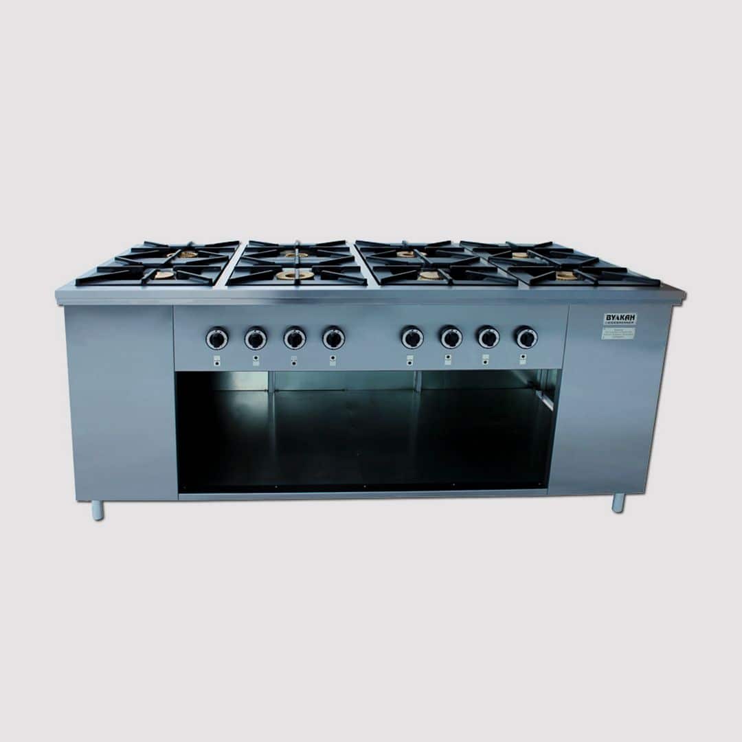 Габариты (шхгхв), мм: 1945х990х850(760) Мощность горелок, кВт: 8х8,0 Мощность духового шкафа, кВт: нет Артикул: 8241 Масса, кг: 270 Расход природного (сжиженного) газа, м3⁄ч (кг/ч): 6,67 (5,19) Резьба входного патрубка газопровода: G¾-B Материал корпуса: нержавеющая сталь Материал решетки: чугун Дополнительные параметры: газконтроль, запальные горелки, пьезорозжиг Комплектация: плита, инструкция Гарантия: 1 год Плита газовая ПРГ-IIA-8 «Maxi» Профессиональная газовая плита с 8-ю мощными двухрядными горелками, изготовленными из латуни материала с высокой стойкостью к коррозии, механическому воздействию и перепаду температур. Каждая горелка имеет массивную чугунную решетку размером 430х430 мм, что позволяет размещать на ней гастроемкости объёмом до 50 л. Съёмная подконфорочная емкость и корпус из высококачественной нержавеющей стали значительно облегчают уход за плитой. В нижней части плиты имеется ниша для хранения кухонного инвентаря. Плита оснащена системой газконтроля, исключающей утечку газа, и может работать как на природном, так и на сжиженном газе. Все горелки имеют пьезоподжиг. Ножки плиты регулируются по высоте, компенсируя неровности пола. С выкрученными ножками высота плиты составляет 760 мм, что существенно облегчает ее транспортировку, позволяя занести в стандартный дверной проем. Плита идеально подходит для предприятий общественного питания с высокой проходимостью. Главными ее достоинствами являются надежность и большая производительность. Для повышения функциональности плиты и оптимизации рабочего пространства кухни на плиты серии Maxi можно установитьДополнительные Опции:. Дополнительные Опции: Распашные двери Мобильная плита (на колесах) Полка боковая навесная (990х300 мм) Двустороннее управление