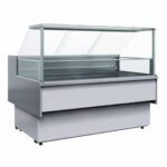 Витрина морозильная Полюс GC110 SL 1,25-1 (с боковинами) – российское низкотемпературное оборудование для установки в мясных и рыбных отделах супермаркетов и продмаркетов. Продукция выкладывается после цикла заморозки в упаковке или в открытой емкости. Модели серии отличаются низким энергопотреблением – установлены низкоэмиссионные стекла, заливная термоизоляция, энергосберегающая подсветка. Особенности модели: статическое распределение температуры, хладоустановка – встроенная; холодильный контур оснащен системой авторазморозки с встроенным ТЭНом; емкость для сбора конденсата оборудована электроподогревом (ПЭН); блок-контроллер – микропроцессорный, программируемые, с цифровым дисплеем; отбойники холода в камере из стеклопакетов, раздвижные створки с тыльной стороны камеры. Стандартная комплектация: пластиковые остекленные боковины с пенополиуретановой термоизоляцией; шлифованные рабочие поверхности из стали пищевой марки (выкладка, столешница); белая теплая подсветка экспозиционной площади (светодиодная); корпус витрины облицован окрашенной сталью, установлен нержавеющий стальной бампер; стальные ножки (высота 50 мм) с винтами для корректировки высоты. Опционно: корзины для выкладки продукции из стальной проволоки с покрытием; поддоны для камеры и полка для весов из коррозионностойкой стали; смена цвета основой подсветки, установка фронтальной подсветки, выбор цвета покрытия корпуса; стыковочный комплект, набор съемных колесных опор.