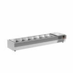 Витрина холодильная Полюс A40 SM 2,1 0430 используется на предприятиях питания для кратковременного хранения и поддержания свежести ингредиентов для пиццы, салатов, также удобна для демонстрации и продажи продуктов в гастрономических ёмкостях. Устанавливается на поверхностях холодильных/нейтральных столов, прилавках, барных стойках, элементах линий раздачи. Характеристики модели: открытая без крышки; гастронормированная GN1/3 (емкости в комплект не входят); полезный объем — 0,08 м3; выкладка глубиной — 1665х313 мм; корпус сделан из нержавеющей стали; система охлаждения — статическая; диапазон температурного режима — +2…+10 ºC; марка хладагента — R134a. Стандартная комплектация: электронный контроллер; авто-оттайка с испарением конденсата; регулируемые ножки. Опции: гастроемкости GN1/3.