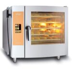 Описание С помощью хлебопекарной печи DeliMaster Вы можете приготовить огромное количество блюд, которые станут излюбленными у клиентов – от хрустящего сладкого и соленого печенья, досконально прожаренного мяса всех сортов, вплоть до хлебобулочных изделий, багет, булок для бутербродов, гамбургеров и т.д. Интуитивное управление и дополнительные функции, которые экономят время, средства и силы персонала, являются стандартными. Это самый популярный типоразмер хлебопекарной печи. Вместимость камеры для запекания рассчитана на 5 уровней = 1,2 м2. Размеры гастроемкостей GN 400×600 мм – стандартный хлебопекарный размер. К печи DeliMaster 5 можно дополнительно закупить широкий ассортимент принадлежностей – подставку из нержавеющей стали, камеру для расстойки теста DeliProofer, вытяжной шкаф Vision Vent и т.д. Модель DeliMaster 5 можно установить в комплекте с печью DeliMaster 5, DeliMaster 8 или с камерой для расстойки теста DeliProofer. Система парообразования работает только на принципе распыления. Источник тепла электрический. Технические характеристики Энергия: электричество Производство пара: инжектор 5 уровней 400/600 (Каталог противней) Площадь выпечки: 1,2 m2 Расстояние [мм]: 85 Размеры(W x H x D) [мм]: 933 x 786 x 863 Вес: 110 кг Полная мощность: 10.2 кВт Предохранитель: 16A Напряжение: 3N~/400V/50Гц Подключение воды / дренаж (мм): G 3/4″ — / 50 Температура: 30 — 300 °C (!) Для смягчения и декальционирования водопроводной воды рекомендуется приобрести водоумягчитель.