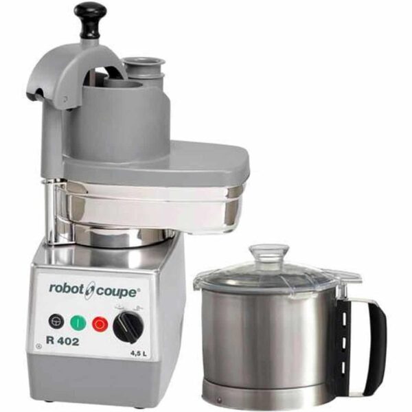 Описание Кухонный процессор Robot Coupe R402 — уникальное оборудование, совмещающее в себе функции куттера и овощерезки. Эффективный, надежный кухонный процессор Robot-Coupe способен удовлетворить профессиональные нужды любого учреждения. Эксплуатация данного оборудования обеспечивает значительный выигрыш в производительности и экономию времени. 1-2 минут достаточно для приготовления майонеза, рубленого бифштекса, морковного или яблочного пюре. С кухонным процессором доступны ВСЕ виды нарезки, измельчения, замешивания теста, размалывания и перемешивания. Дополнительный кулинарный набор, состоящий из насадки для приготовления соусов и насадки-соковыжималки для цитрусовых, позволяет производить фруктовые и овощные пюре для приготовления закусок, супов, смузи, соусов из ягод, подлив, варенья, мармеладов и т.д. Особенности Чаша емкостью 4,5 литра из нержавеющей стали с ручкой. Крышка легко устанавливается на емкость. Аппарат поставляется с гладким ножом со съемным колпачком. Опционально: зубчатый нож для размалывания и замешивания теста, нож с мелкими зубьями для измельчения петрушки. 2 скорости: 750 и 1500 об/мин. Скорость 1500 об/мин предусмотрена для функции куттера. Съёмные чаша и крышка из нержавеющий стали. Автоматический запуск аппарата с помощью рычага обеспечивает удобство и быстроту работы. Большая воронка (площадь 104 см²) для нарезки объемных овощей, таких как капуста, сельдерей, салат или томаты. Круглая воронка (Ø 58 мм) для нарезки длинных овощей и деликатной нарезки нежных продуктов, обеспечивающая высокую точность нарезки. Полная гамма дисков из нержавеющей стали для нарезки овощей и фруктов : слайсер, фигурные ломтики, брусочки, терка, кубики, соломка/фри. Характеристики Блок двигателя: Трехфазный 750/1500 об/мин Комплект куттера: чаша из нержавеющей стали объемом 4.5 л Комплект овощерезки: опционально 22 дисков из нержавеющей стали на выбор Комплектуется 6 дисками: слайсер 2 мм, терка 2 мм, соломка 4х4 мм, комплект для нарезки кубиками: ломтики 10 мм + решетка 10х10х10 мм, диск-слайсер