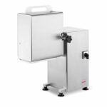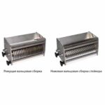 Описание Настольный стейкер TFS состоит из базового узла и навесного устройства. Базовый узел содержит привод для стейкера. Высококачественные элементы зубчатых зацеплений гарантируют малошумное движение и длительный срок службы. Быстрозажимные элементы для фиксации навесных узлов обеспечивают надежное крепление и облегчают переналадку устройства. При возможной перегрузке срабатывает защитный автомат, что предотвращает повреждение приводного электродвигателя. Система безопасности устройства гарантирует, что пуск машины возможен, только если кожух-воронка присоединена и зафиксирована. Стандартный комплект оснастки стейкера включает (см.фото): — ножевая вальцовая сборка стейкера (542290) — 1 шт.; — кожух-воронка стейкера FS (544124) — 1 шт.; — толкатель (543 058) — 1 шт. Опционально поставляется (см.фото) -ножевая вальцовая сборка стейкера (542291); Для переоборудования стейкера в полоскорезку ассортимент может быть дополнен: — режущей вальцовой сборкой 3,3 мм (542 292); — режущей вальцовой сборкой 5,0 мм (542 293); — режущей вальцовой сборкой 10,0 мм (542 294). Для переналадки стейкера в салаторезку ассортимент может быть дополнен: — режущей вальцовой сборкой 3,3 мм (542 292); — режущей вальцовой сборкой 5,0 мм (542 293); — режущей вальцовой сборкой 10,0 мм (542 294); — кожух-воронка SA ST S (544 147) Благодаря установке режущих вальцевых сборок 3,3 / 5 или 10 мм, можно использовать стейкер как полоскорезку. Если дополнительно заменить кожух-воронку стейкера кожухом салаторезки, машина преобразуется в салато-полоскорезку 3,3 / 5 или 10 мм. Из соображений безопасности кожух-воронка (направляющий кожух) SA ST S может применяться только в сочетании с режущими вальцевыми сборками (исключая ножевые сборки стейкера). Кожух-воронка FS напротив, может использоваться для всех вальцевых сборок.